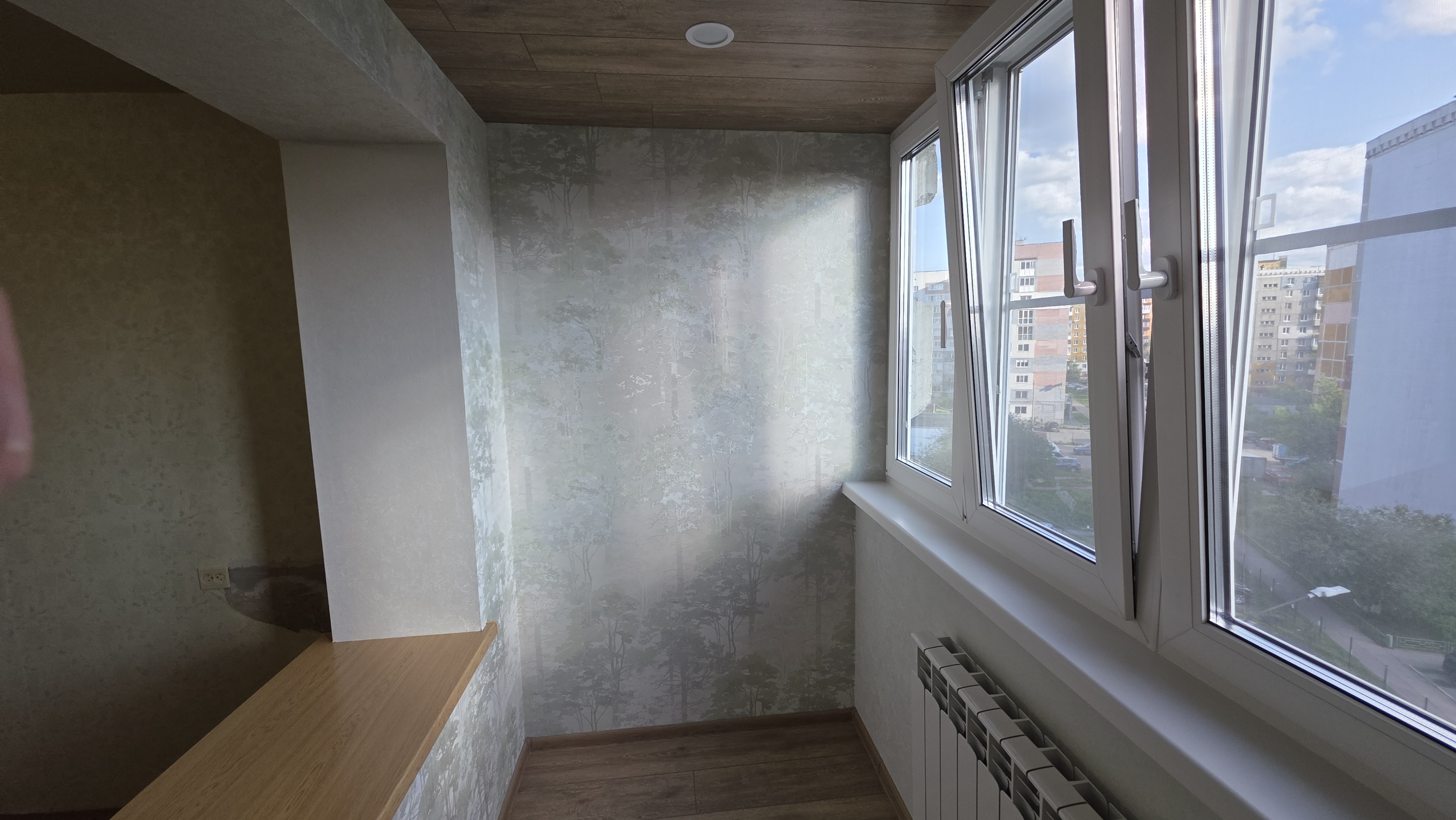 В отделке лоджии совместили обои и ламинат.